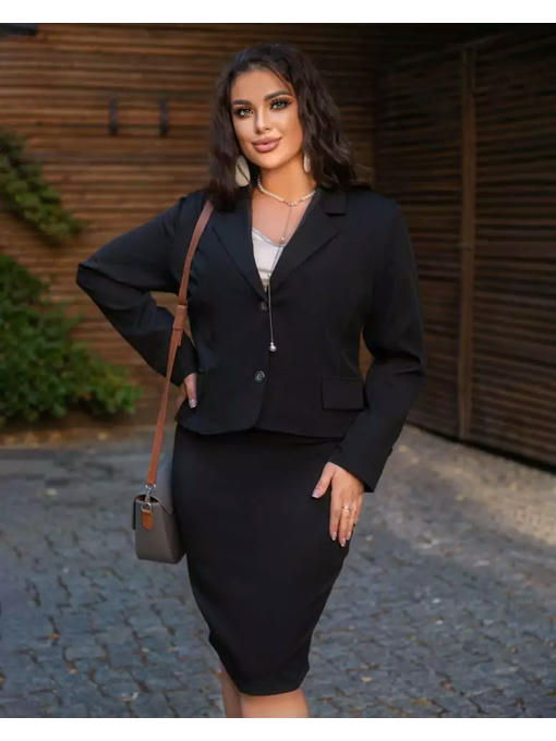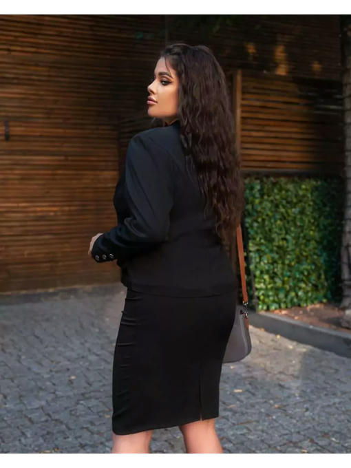 Костюм двойка, с классическим пиджаком на подкладке, застегивающейся на пуговицы по всей длине и прямая юбка с разрезом сзади, застегивается на молнию