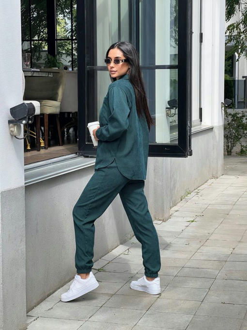 Костюм прекрасно сочетается как с каблуками для создания нарядного образа, так и с кедами для повседневного стиля.