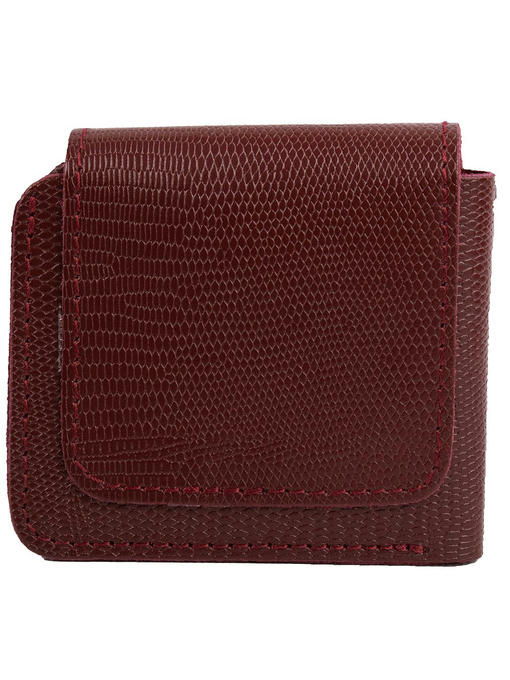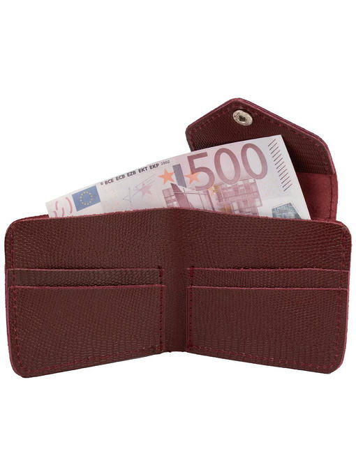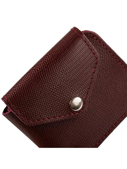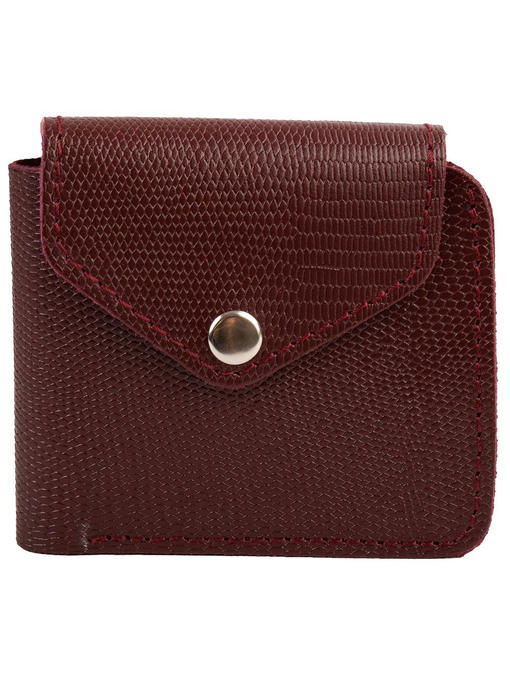 Хорошо, когда в гардеробе есть аккуратный, карманного формата кошелёк. Модель из натуральной кожи интересна не только компактностью, но и лёгкостью конструкции, приятной фактурной поверхностью, роскошным бордовым цветом натуральной кожи. Аксессуар складывается пополам и надёжно застёгивается широким клапаном на механической кнопке. Детали изделия крепко прошиты соединительными швами, открытые срезы демонстрируют непринуждённую красоту природного материала. Устройство рассчитано на размещение купюр и самых необходимых карточек, такой кошелёк-портмоне удобен в гардеробе, когда хочется свести к минимуму содержимое сумки