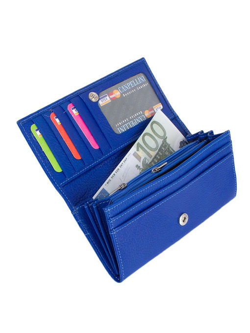 Выбирать новый кошелек – дело занимательное и довольно ответственное, ведь этот предмет гардероба, если он качественный, прослужит долго и, значит, надолго определит и стиль, и удобство обращения с наличностью. Модель торговой марки CANPELLINI обращает на себя внимание, в первую очередь, ярко-синим цветом – он смотрится интересно и неизбито, поскольку многие женщины предпочитают более спокойные «кошельковые» цвета. Но если Вы остановите выбор на данном варианте, то не пожалеете, – аксессуар сделает гардероб разнообразнее, модным цветом подчеркнет Ваши пристрастия в отношении яркости, красоты, новизны. К тому же, брендовый кошелек из натуральной кожи – то, что нужно, для его долговечности и надежности