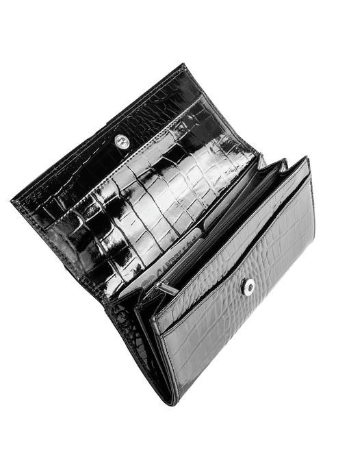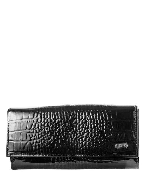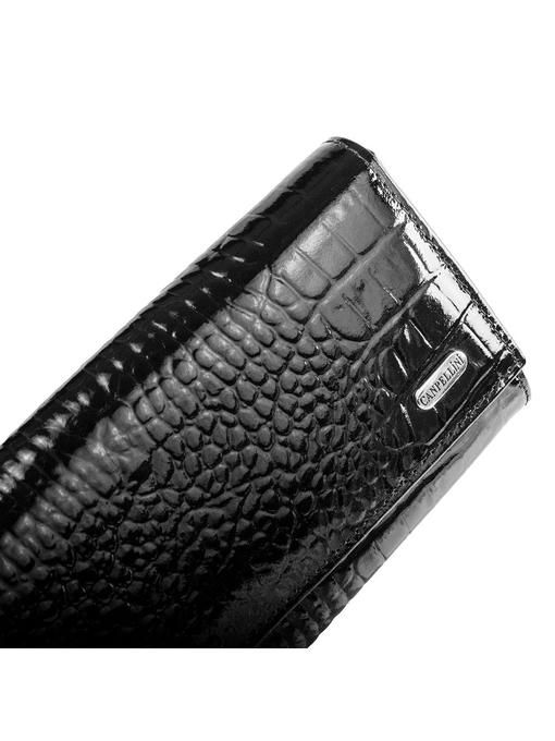 Надёжный, большой, красивый кошелёк чёрного цвета из добротной натуральной кожи с модным тиснением и гладкой, блестящей на свету поверхностью станет в Вашем гардеробе выгодным и полезным приобретением. Такая вещь всегда на виду, и поэтому женщине важно, чтобы она была модной, удобной, презентабельной. Данная модель хороша по всем параметрам. Горизонтальное расположение просторных отделений для купюр и сопутствующих кармашков для десятка карточек способствует быстрому нахождению всего, что нужно владелице. Большое количество дополнительных отделений-отсеков и кармана-монетницы на молнии – тоже сподручные и важные моменты в устройстве повседневно востребованного кошелька-портмоне. Высококачественная кожа и крепкая прошивка по всем швам, аккуратно оформленные края и уголки делают изделие долговечным