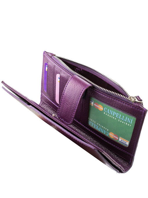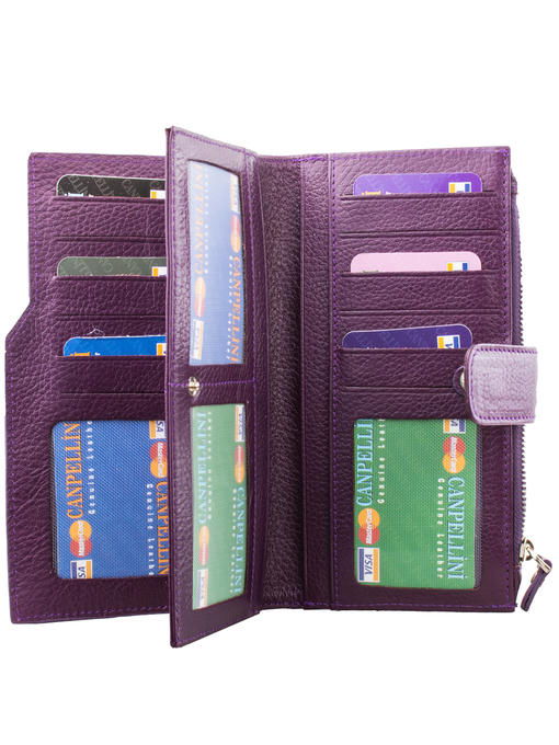 Цвет, конструкция, дизайн – в этом женском кошельке соединились классика и оригинальность, удобство и представительность. Модель из коллекции турецкого бренда CANPELLINI привлекает многими параметрами. Натуральная кожа фиолетового насыщенного оттенка – интересное решение для полноформатного большого аксессуара. У нас есть возможность сполна оценить красоту такого материала, а вместе с ней – продуманное решение по размещению большого количества отделений разного размера. Два отдельных разворота, монетница на молнии, изящная тонкость формы, жёсткость и женственность в едином образе – аксессуар достоин того, чтобы украсить Ваш гардероб