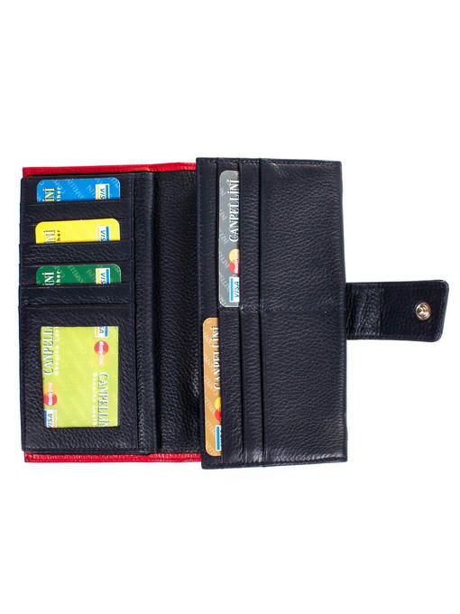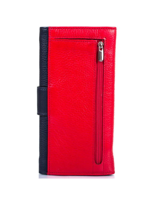 Кошельки красного цвета – самый правильный аксессуар для хранения Вашей наличности. Именно такой цвет, согласно традиционному верованию восточных народов, словно магнит, притягивает удачу в денежных делах. Это изделие, которое сейчас перед Вами на экране, точно пригодится сильной и уверенной в себе женщине. Этот кошелек красив и элегантен. И при этом в сумочке он займет совсем немного места. Аксессуар из натуральной кожи, а это значит, что он весьма долговечен, но при этом абсолютно неприхотлив. Такую модель хорошо купить в пару к женской сумочке такого же оттенка, которая, подобно этому кошельку, имеет вставки синего цвета.
