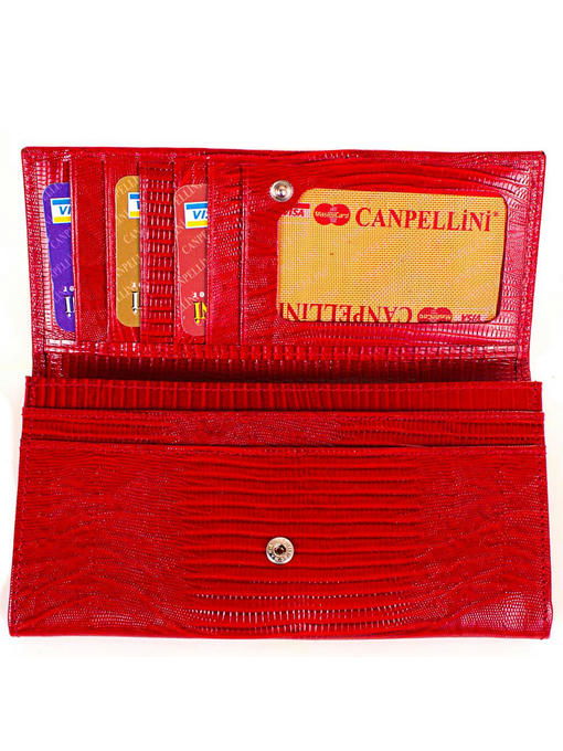На тыльной стороне кошелек имеет один большой горизонтальный накладной карман, а также прорезной карман на молнии.