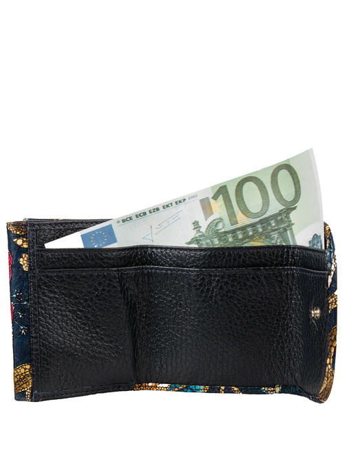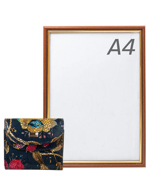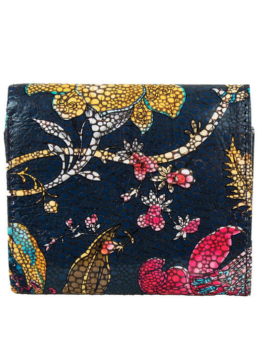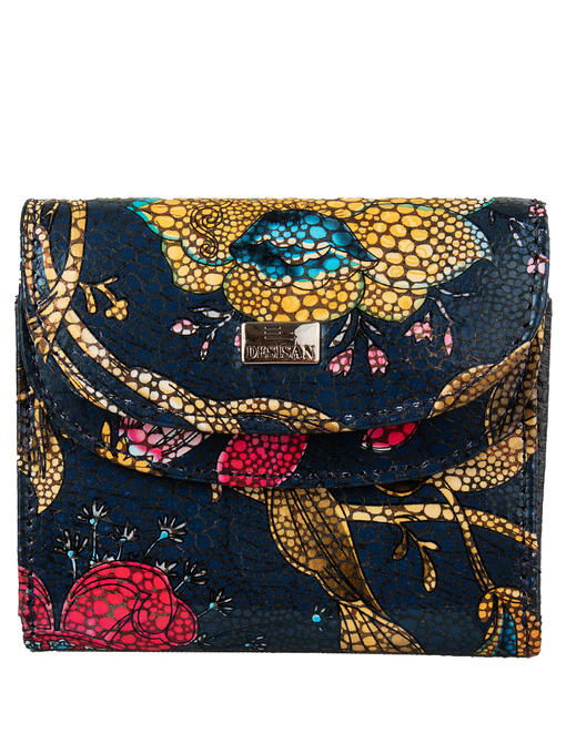 Цветной и яркий, этот интересный компактный кошелёк быстро станет одним из любимчиков среди разнообразных вещей в гардеробе женщины. Аксессуар торговой марки DESISAN сразу привлекает красочным цветочным рисунком на тёмно-синем фоне. Такой вид натуральной кожи не назовешь привычным, благодаря этому вещица выглядит очень оригинально. Своеобразная фактура, отличное качество материала соединяются воедино. Конструкция тоже довольно необычная, хоть и простая. Изюминкой выступают два скруглённых клапана. У них разные задачи – открывать доступ к двум отсекам изделия – раскладной части с отделениями для купюр и карману для мелочи. Устроено всё рационально, что поможет Вам в минималистичном формате обращаться с наличностью, не утяжеляя повседневный или вечерний гардероб полноформатным кошельком-портмоне