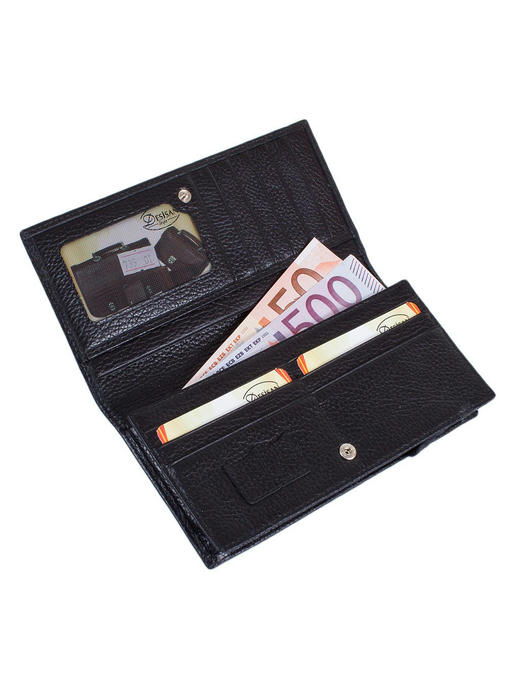 Кошелек в гардеробе – вещь особенная. Его стараются выбрать из качественных брендовых моделей, подходящего цвета и конструкции, ведь аксессуар для обращения с деньгами должен служить долго, нравиться владелице и даже быть своеобразным источником для вдохновения и хорошего настроения. Вариант, предложенный торговой маркой ДЕСИСАН, дышит деловой практичностью черного цвета и оригинальностью. Большая вертикальная модель разделена на два отсека, один из которых фиксируется механической кнопкой, а второй застегивается на «молнию». Кошелек позволяет разделить деньги на текущие расходы и те, которые отложены про запас; в нем много дополнительных отделений для карточек, сим-карт, документов