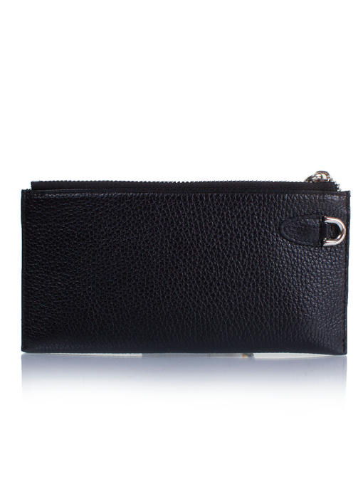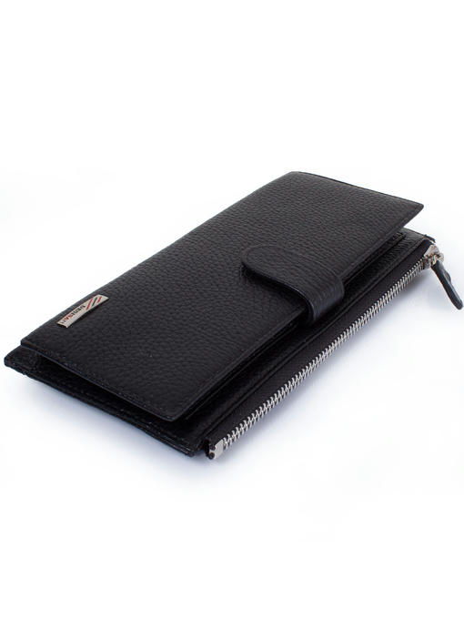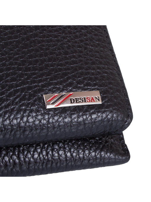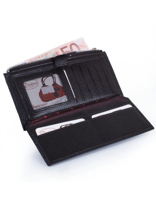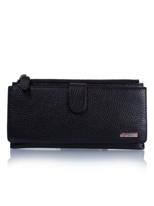 Этот женский кошелек может стать еще и аккуратным деловым клатчем, поскольку прямоугольная форма с четкими углами, черный цвет, фактура добротной натуральной кожи, особенности конструкции делают его презентабельным, да, к тому же, к нему легко пристегивается кистевой-ремешок. Функциональный аксессуар разделен на две автономных части, и каждая застегивается по-своему. Для денег предусмотрен собственно кошелек на «молнии», а откидная панель под хлястиком-клапаном на кнопке – элемент портмоне и визитницы одновременно, где расположены нужного формата кармашки-отделения. Ровные линии швов, надежная и красивая отделка гармонируют с яркой, но скромной эмблемой бренда DESISAN в кошельке