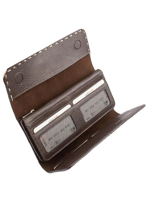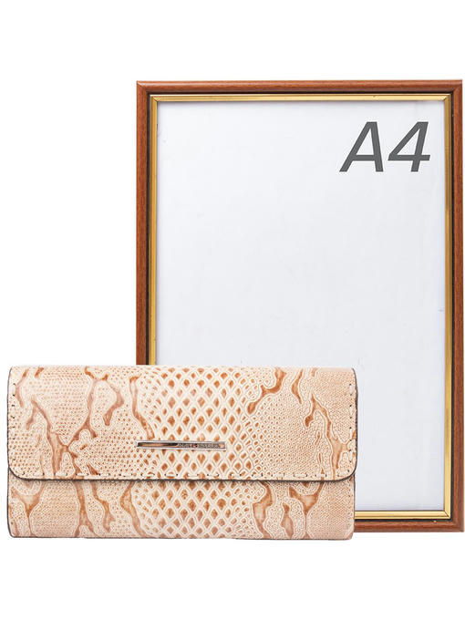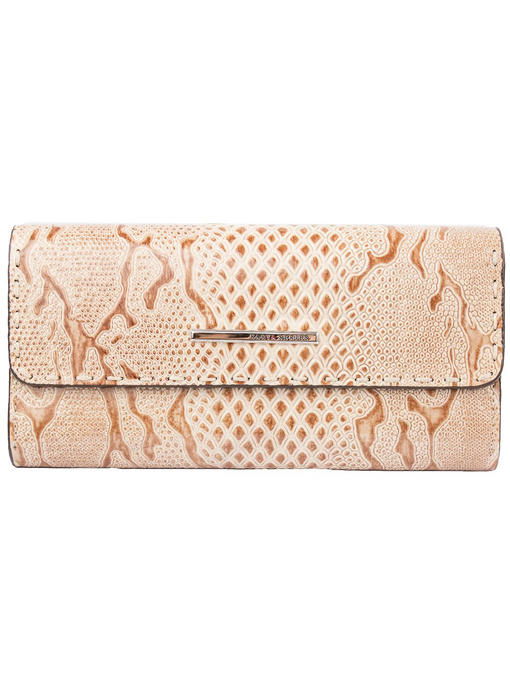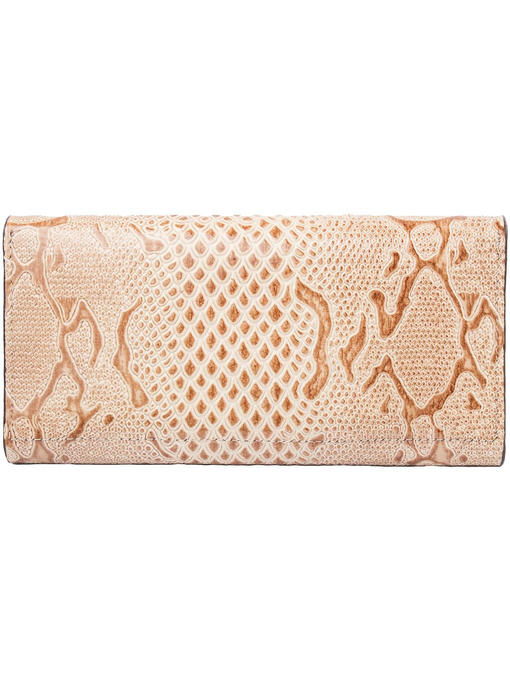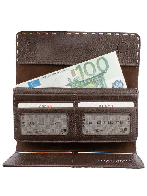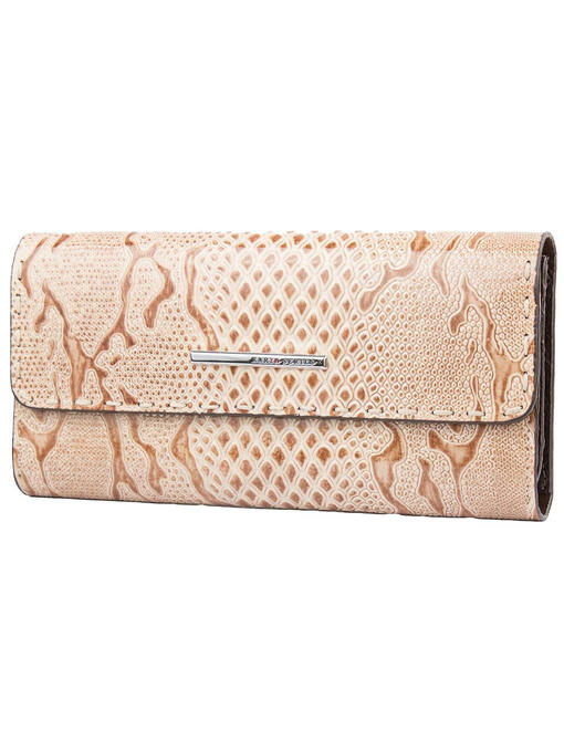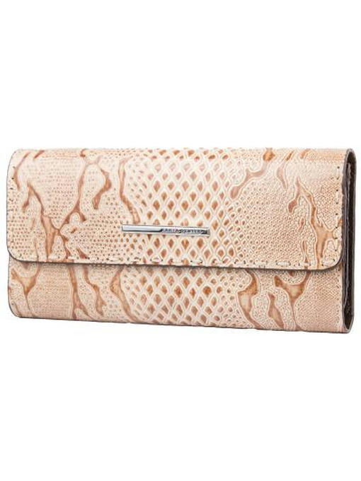 Красивый кошелёк, интересно устроенный внутри, долго будет радовать владелицу модным видом, отличным качеством и удобством. Аксессуар торговой марки KARYA изготовлен из натуральной кожи с приятными оттеночными нюансами в рисунке и лёгкой фактурности под рептилию. Фурнитура под серебро ярко представлена тонкой прямоугольной металлической фирменной эмблемой, украшающей клапан. Конструкция кошелька-портмоне привлекает оригинальностью и большим количеством разнообразных отделений и карманов. Здесь Вы свободно разместите купюры, монеты, почти два десятка карточек и несколько малоформатных документов при необходимости. Аккуратная отделка внутри и снаружи – показатель аксессуара высокого уровня