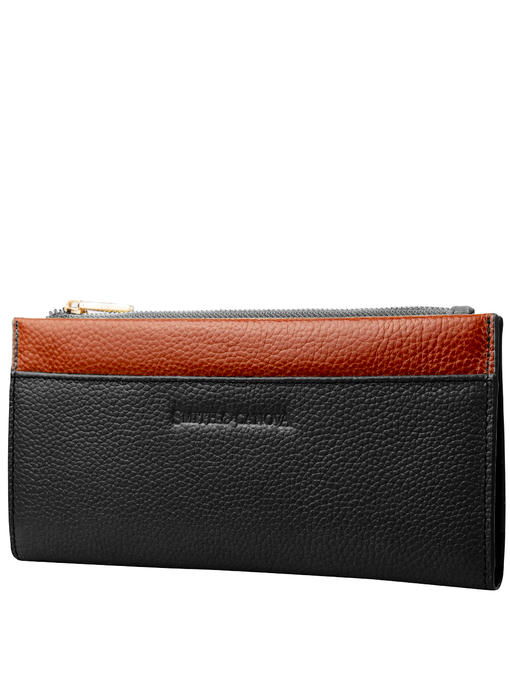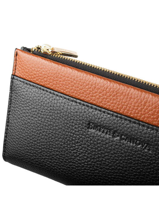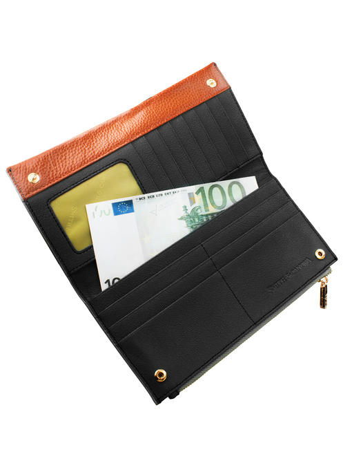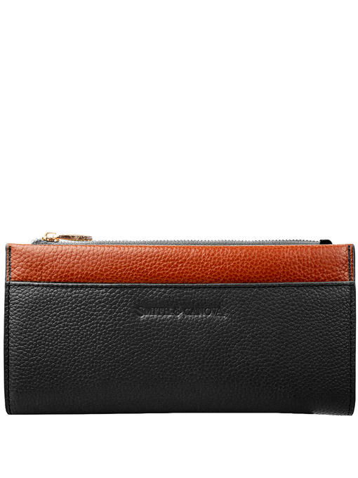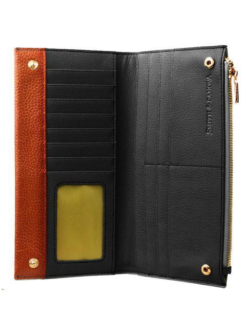Интересное устройство дополняется в этом женском кошельке стильной, с элементами яркости и тепла цветовой гаммой. Большая прямоугольная модель имеет форму с чёткими контурами и строго прямыми верхними углами, плавно изгибается она только по одной линии. Выглядит изделие женственно и по-деловому. Комбинирование кожи одинаковой фактуры и разного цвета образует привлекательный чёрно-коричневый ансамбль, где немалую роль играют ещё и немногочисленные детали фурнитуры с золотистым ярким блеском. Модель торговой марки СМИТЭНДКАНОВА фиксируется парой механических кнопок в части, предназначенной для купюр, карточек, малоформатного документа, а второй отсек, который одинаково хорошо подходит для мелочи или банкнот, закрывается молнией