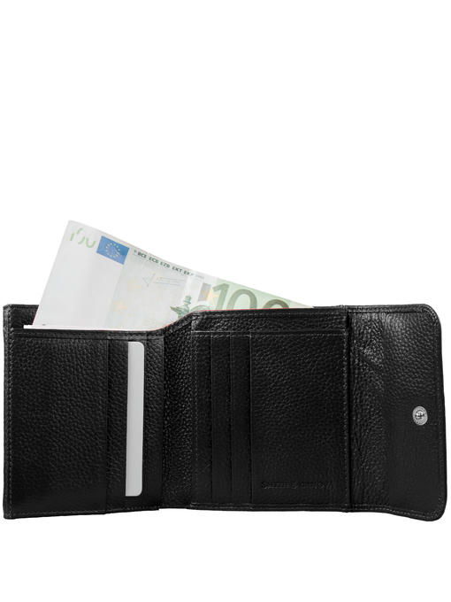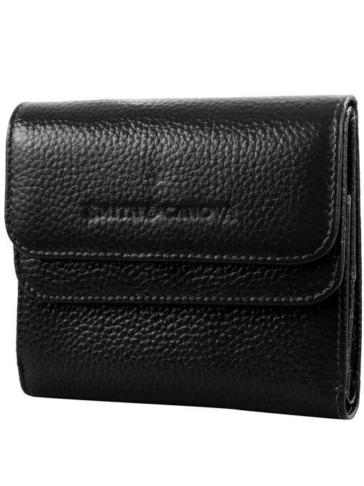 Скромный и деловой, чёрный цвет для кошелька – один из лучших вариантов. Особенно, когда изделие изготовлено из добротной натуральной кожи и отличается брендовым качеством изготовления. Такой вещице не будет сносу, и уход с модной орбиты ей не грозит. В этой модели английской марки SMITH&CANOVA к названным преимуществам добавляется оригинальное устройство кармана-монетницы и компактная складная форма. Два клапана с механическими кнопками открывают доступ к двум автономным отсекам, пользоваться каждой частью очень удобно. Уверены, Вы без проблем сможете доставать монеты, свободно размещать купюры и необходимое для ежедневных расчётов количество карточек.