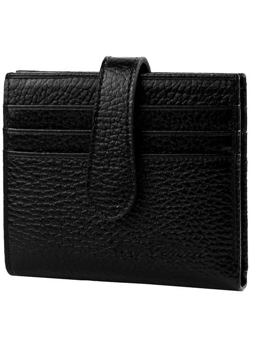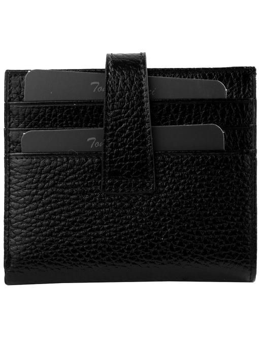 Тонкий кожаный кошелёк-портмоне респектабельно-делового чёрного цвета заслуживает Вашего внимания. Модель из коллекции торговой марки TONY BELLUCCI смотрится интересно благодаря фигурному клапану-хлястику, который фиксирует содержимое наружных карманов-отделений для карточек и внутренних отделений. Эта деталь добавляет изящества в строгий однотонный образ, как и малая толщина кошелька. Одно сложение делает аксессуар компактным, стильным, удобным для ношения в небольшой сумочке. Устройство здесь не сложное, подходит для тех, кто большую часть платежей выполняет с помощью банковских либо дисконтных карт. Качество изготовления брендового портмоне заслуживает доверия, края и углы радуют глаз точностью линий