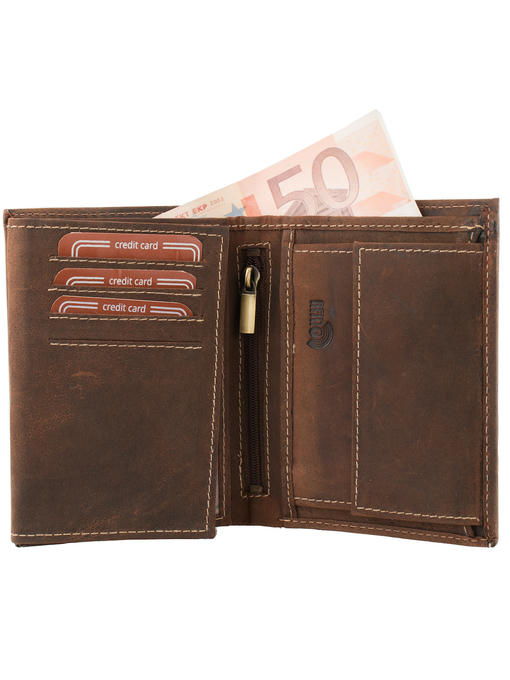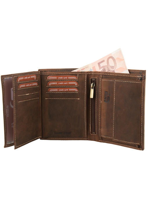 Изделие упаковано в фирменную коробку. кошелек винтажного стиля торговой марки Buffalo Wild. Сделанный из натуральной кожи Crazy Horse. Имеет матовую структуру, которая отличается потертостями и неоднородной окраской, которая проявляется более выраженно в процессе использования.