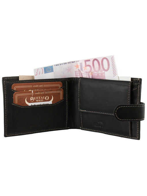 Стильное функциональное кожаное мужское портмоне от польского бренда Buffalo Wild. Популярная модель, которая имеет все необходимые отделения. Кошелек имеет 2 отделения для купюр. Также портман имеет отделение для монет, которое закрывается на механическую кнопку и несколько отделений для визиток и банковских карт.