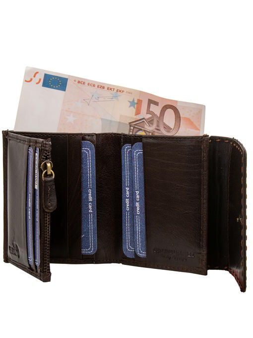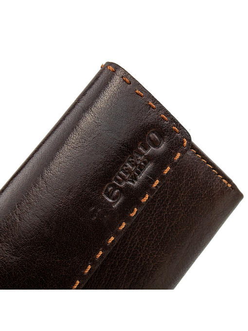 Уютный и по-домашнему тёплый образ создали дизайнеры польской кожгалантерейной марки BUFFALO WILD, предлагающей в новой коллекции компактный мужской кошелёк. Эластичная и прочная натуральная кожа коричневого цвета образует мягкие сгибы, её красиво дополняют декоративно-функциональные строчки, выполненные более яркими нитями, и фурнитура под бронзу. Фирменный оттиск стильно украшает лицевую сторону. Аксессуар карманного формата надёжен и удобен. Он крепко застёгивается на молнию, разворачивается в сподручный набор отделений и карманов. Устройство радует практичностью – имеется место для монет, купюр, карточек. Качество проработки швов – на высоте.