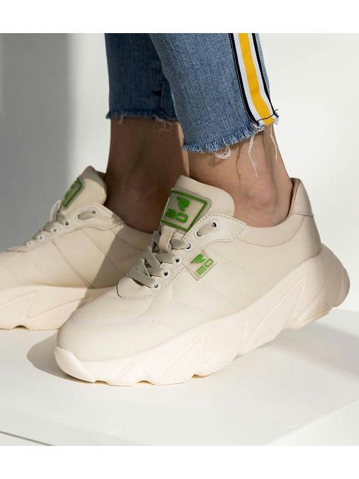 Бежевые кроссовки из натуральной кожи и ярким логотипом привлекут внимание к Вашим ножкам. За счет высокой подошвы Ваши ножки будут визуально выглядеть длиннее. Стелька кожаная, что обеспечит комфорт в течение всего дня.