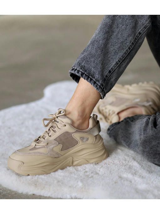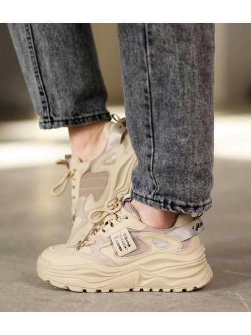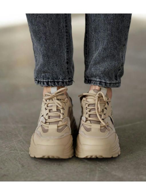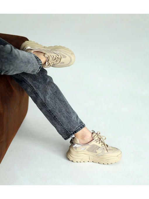 Универсальная модель кроссовок в бежевом цвете. Пара изготовлена из сочетания натуральной кожи, текстиля и замши. Кроссовки легкие, вес полупарка всего 300 грамм. Внутренняя подкладка кожаная, стелька – memory, кожаная. Подошва износостойкая, ее высота – 3-5 см; Кроссовки невероятно комфортно чувствуется на ножках, прекрасно подойдут под любой Ваш образ.
