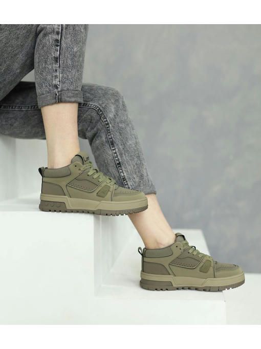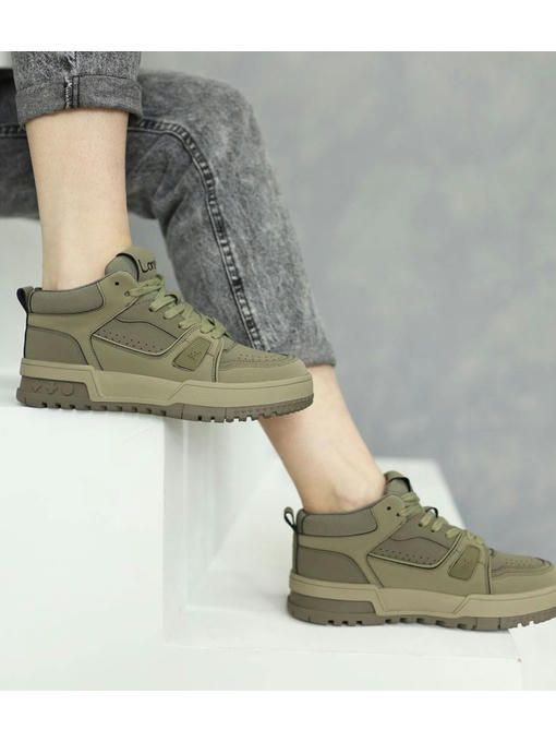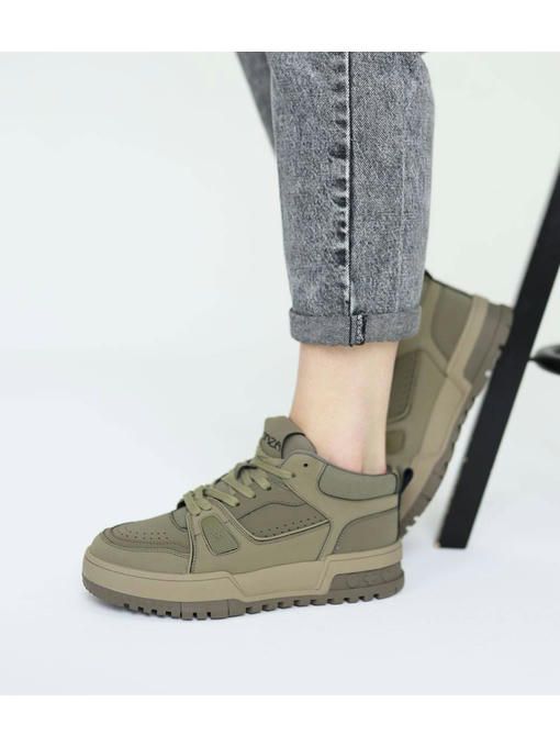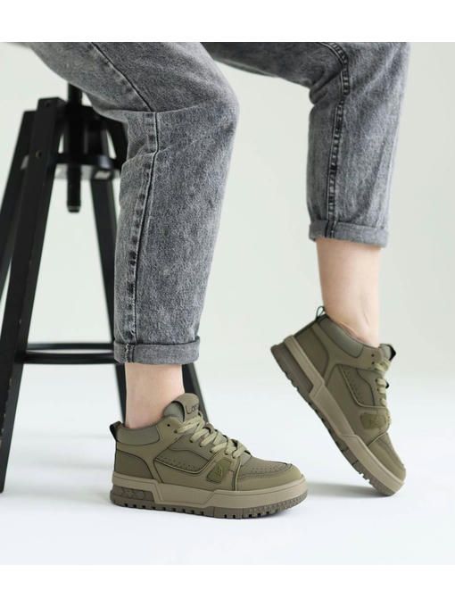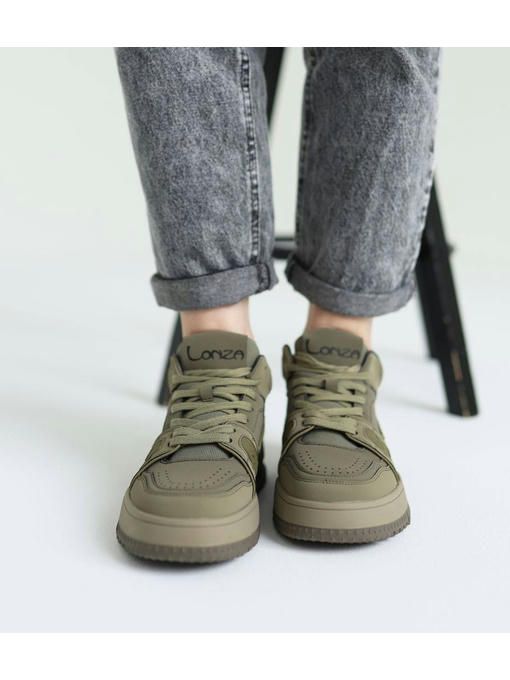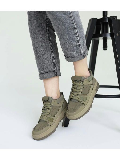 Стильная модель кроссовок в цвете хаки. Пара изготовлена из натуральной кожи, легкая, вес полупарка всего 370 грамм. Внутренняя подкладка выполнена из текстиля, стелька – memory, кожаная. Подошва полиуретановая, износостойкая, ее высота – 3,5-4 см; Кроссовки невероятно комфортно чувствуется на ножках, прекрасно дополнят Ваш стильный образ.