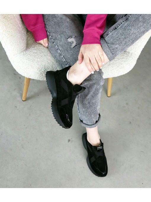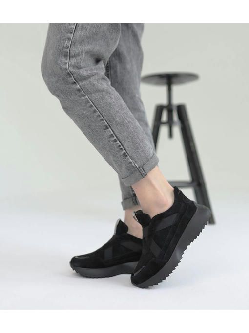 Черные кроссовки – актуальная, стильная и удобная пара, выполненная из натуральной замши. Пара на резинках, легко и быстро обуваются. Внутренняя подкладка текстильная, стелька кожаная – комфортно чувствуется при ношении. Кроссовки легкие, вес полупарка – 250 грамм, универсальные, идеально подойдут на каждый день и под каждый образ.