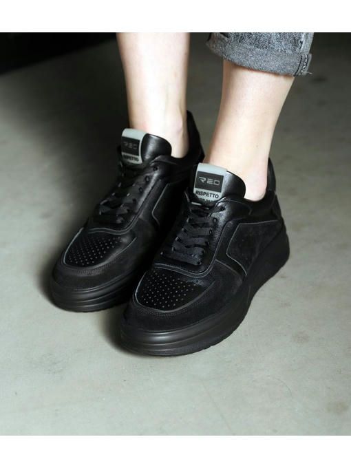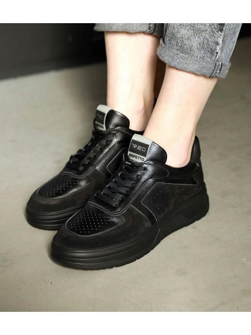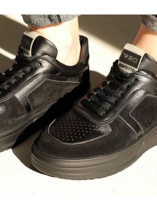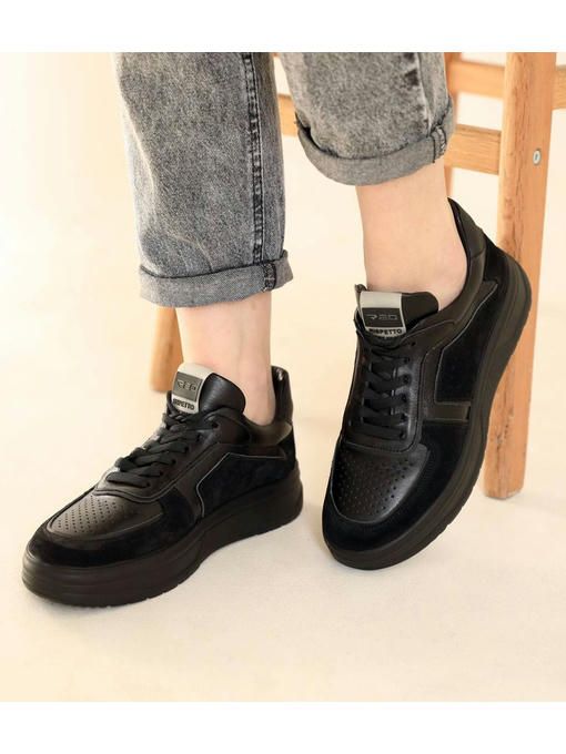 Черные кроссовки из натуральной кожи и замшевыми вставками отлично подойдут к каждому Вашему образу и будут привлекать внимание окружающих. Невероятно стильные и практичные. За счет высокой подошвы Ваши ножки будут визуально выглядеть длиннее, а кожаная стелька обеспечит комфорт в течение всего дня.