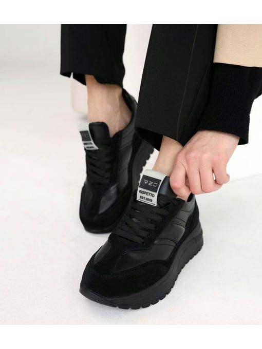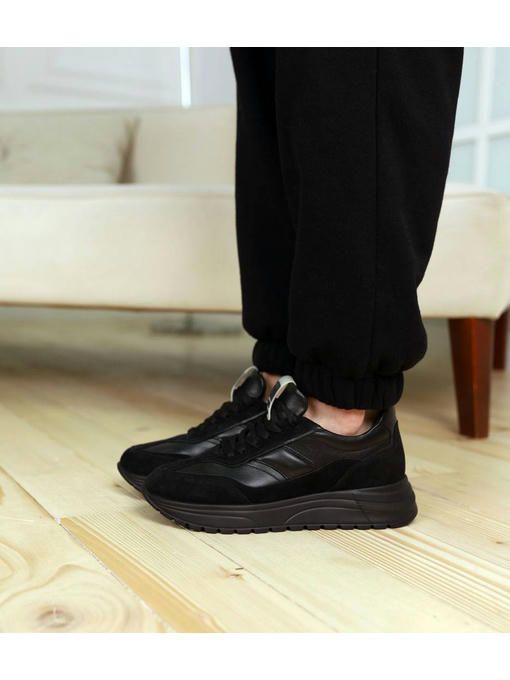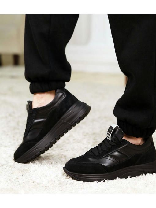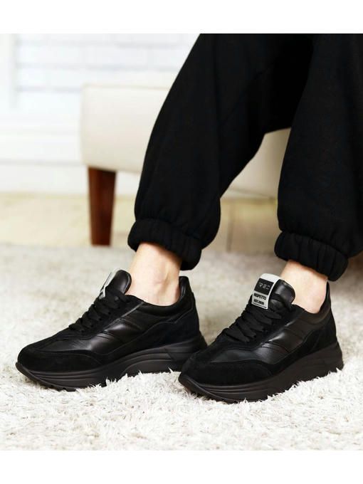Черные кроссовки из натуральной кожи и замшевыми вставками прекрасно подойдут к каждому Вашему образу и будут привлекать внимание окружающих. Невероятно стильные и практичные. За счет высокой подошвы Ваши ножки будут визуально выглядеть длиннее, а кожаная стелька обеспечит комфорт в течение всего дня.