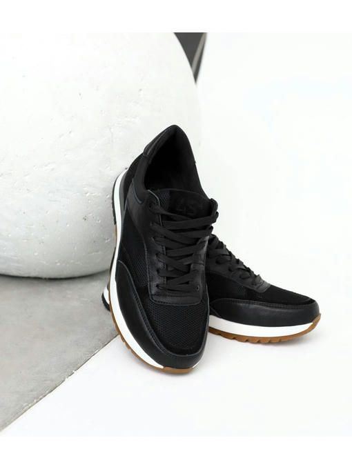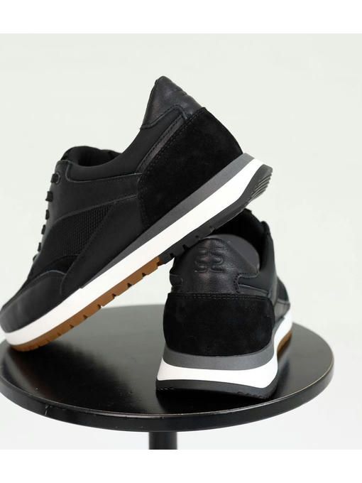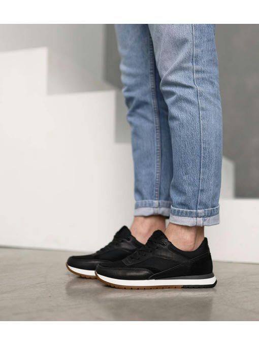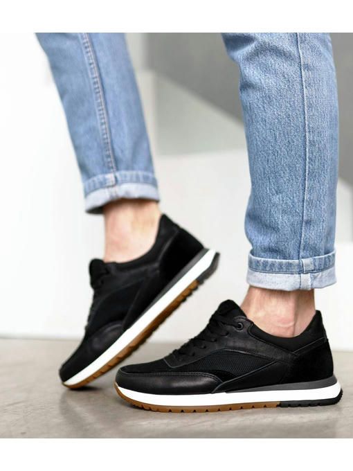 Мужские кроссовки в черном цвете, выполнены с сочетанием натуральной кожи, замши и текстиля. Внутренняя подкладка текстильная, стелька – текстильная, просиликоненная. Стильная износостойкая подошва – EVA. Кроссовки легкие, вес полупарка – 390 гр. Максимально комфортная и универсальная пара, которая отлично подойдет к каждому образу.