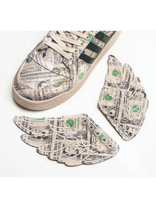 Джереми Скотт, переходит в съемное 3D-крыло, наложенное на боковую сторону кроссовка.