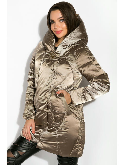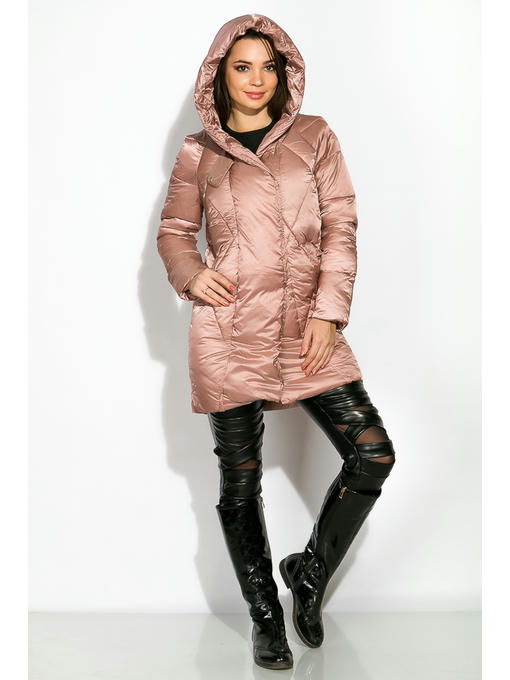Обладающая небольшим весом, и в тоже время очень теплая женская, стеганая куртка удлиненного фасона, оборудована объемным капюшоном, а также двумя боковыми карманами на кнопках. Центральная застёжка осуществляется на тракторную молнию с двумя бегунками и наружный, ветрозащитный клапан с кнопками. Дополнительным элементом, является расположенный в районе ворота широкий пат с декоративным украшением, застегивающийся на металлическую кнопку.