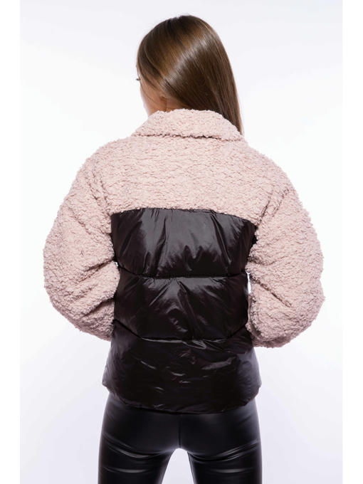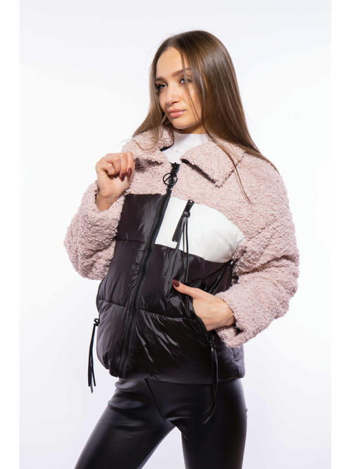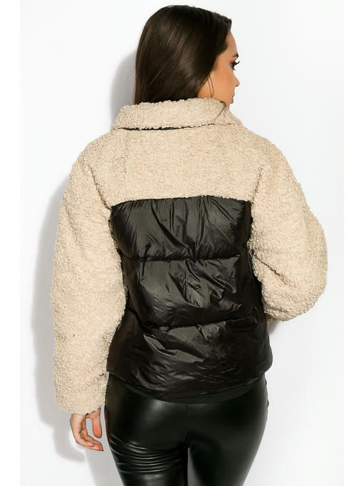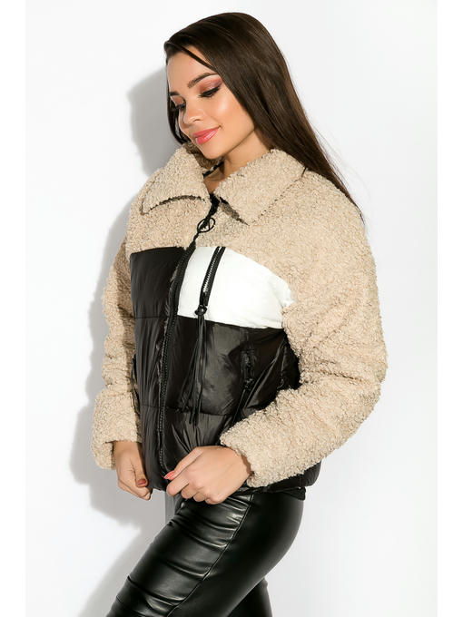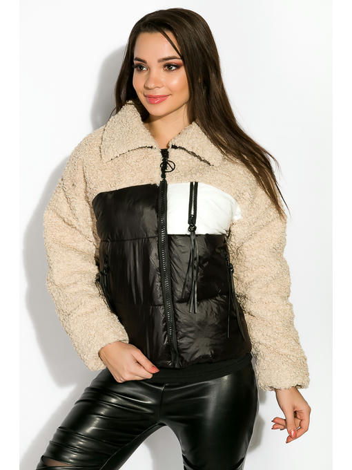 Укороченная женская куртка из комбинированных материалов. Верхняя часть изделия, включая воротник и рукава, выполнена из акрила имитирующего овечью шерсть, в то время как нижняя половина состоит из стеганой плащевки. Спереди расположены два кармана на молнии, с декором бегунков кисточками из искусственной кожи и нефункциональная имитация входа в нагрудный карман с контрастной отделкой. Тепло и комфорт, обеспечивается благодаря наличию синтетического утеплителя.