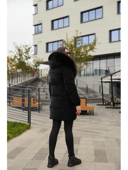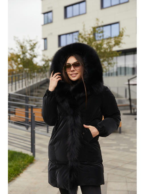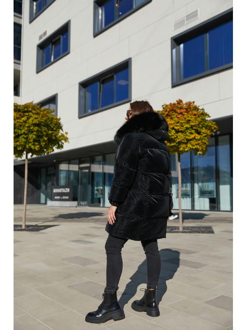 Удлиненный пуховик из бархатной плащевой ткани с натуральным мехом песца.