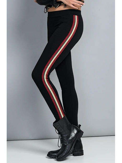 Облегающие хлопковые леггинсы с широким поясом. Боковая часть модели декорирована яркими лампасами с блестящим люрексом