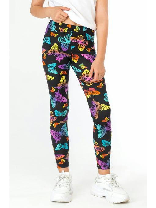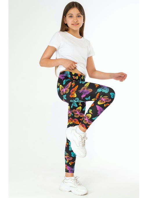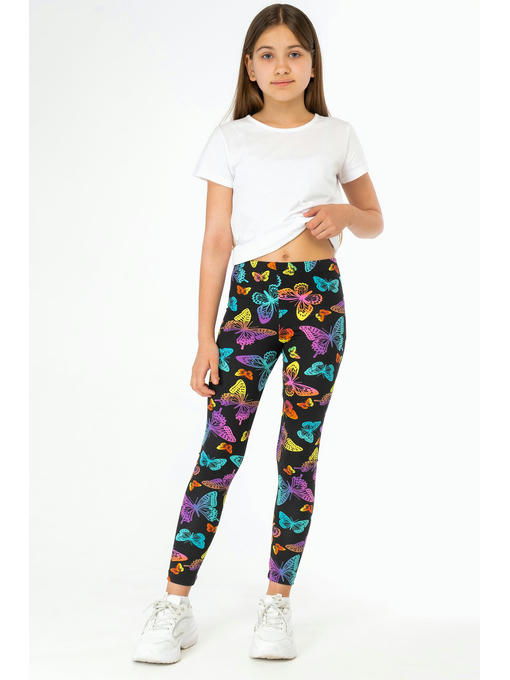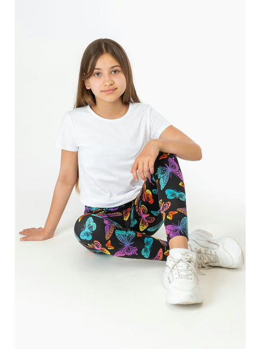 Облегающий крой, в поясе мягкая резинка. Хорошо тянутся. Легинсы с принтом бабочки очень удобные, из мягкого материала. Идеально подойдут для занятия спортом, гимнастики, повседневного использования, прогулок, путешествий, в школу на физкультуру, в детский сад. Легинсы для девочек выполнены из хлопкового трикотаж.