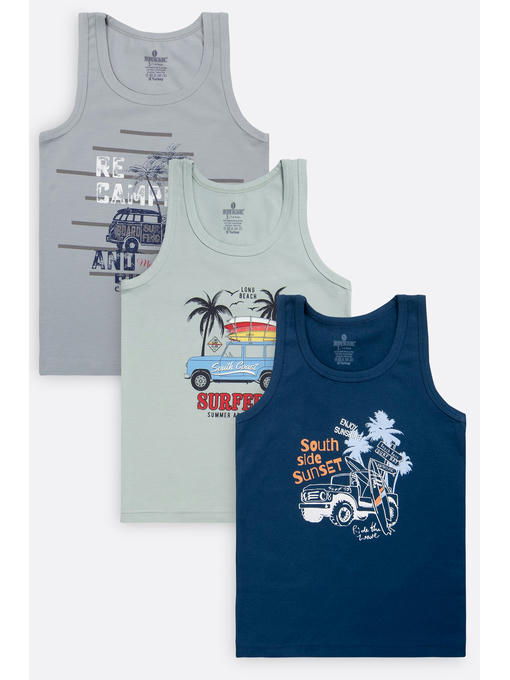 В наборе представлены майки разных оттенков, 3 шт. Базовые детские майки классического кроя на широких плечиках и круглым вырезом на каждый день в детский сад, школу. В набор детских маек входят майки с принтом Машина.
