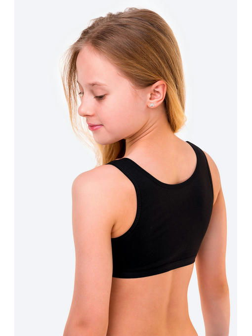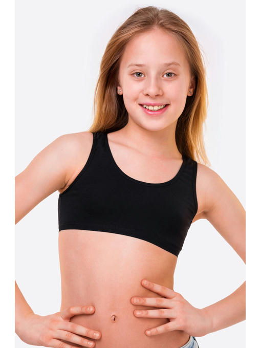 Однотонный бюстик без косточек черного цвета можно использовать в качестве спортивного топа и надевать на тренировки, занятия танцами, гимнастикой, спортом в секции и на уроках физкультуры. Повседневный хлопковый топик без рисунка подойдет для жаркой летней погоды, теплой весны и осени, морозных зимних дней.