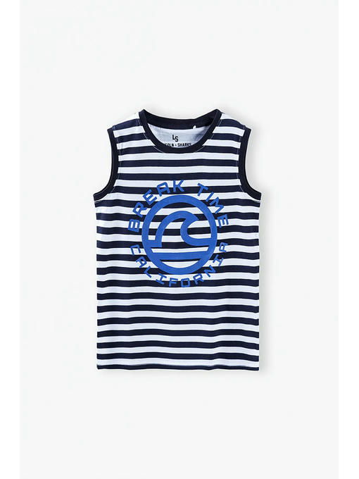 – майка украшена полосатым принтом, а также принтом в виде значка и надписи