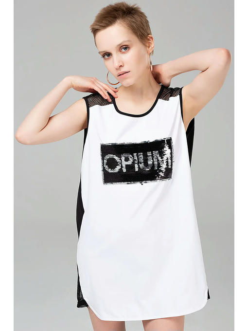 Женская майка для смелых и дерзких! Актуальная черно-белая гамма, оригинальный крой, сетчатый вставки на плечах и по бокам, а главное – волшебная аппликация на груди из черно-серебристых пайеток, которые в одном направлении образуют слово ROCK, а в другом OPIUM. Эту майку хочется бесконечно рассматривать и гладить, создавая новый рисунок! Замечательное решение для вечеринки и дискотеки
