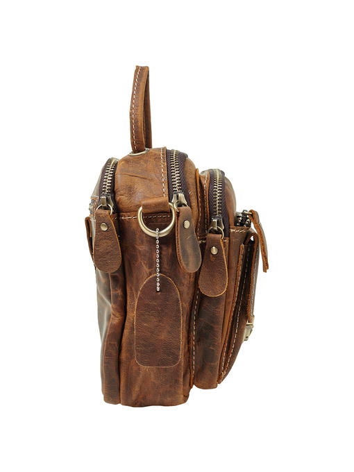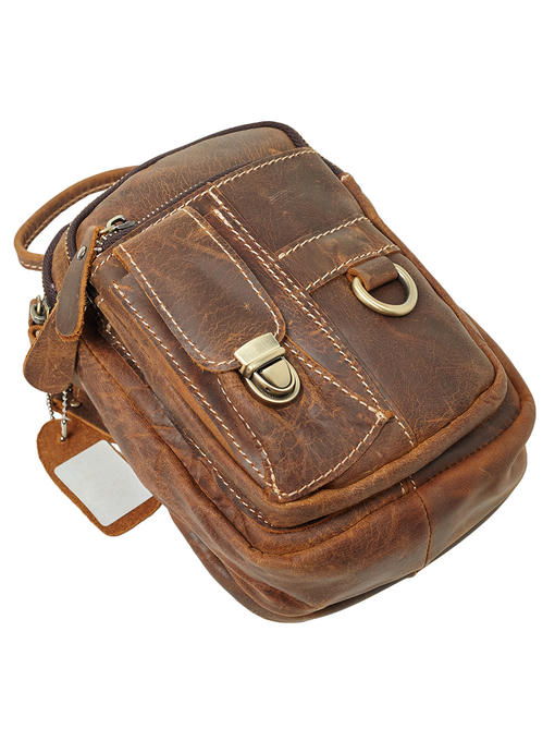 Размеры: 15*21*8 см. Материал: кожа. Цвет: коричневый. Цвет фурнитуры: золото. Количество основных отделений: 2. Внутри есть карман на молнии. На лицевой стороне 3 дополнительных кармана (2 накладных и 1 прорезной). На тыльной стороне прорезной карман на молнии. Имеет ручку и съемный плечевой ремень, который можно регулировать по длине (максимальная длина – 140 см). Можно также носить на поясе. Изделие закрывается молнией. Документы формата А4 не помещаются в изделие. Страна происхождения торговой марки BUFFALO BAGS, а также страна-производитель – Китай.