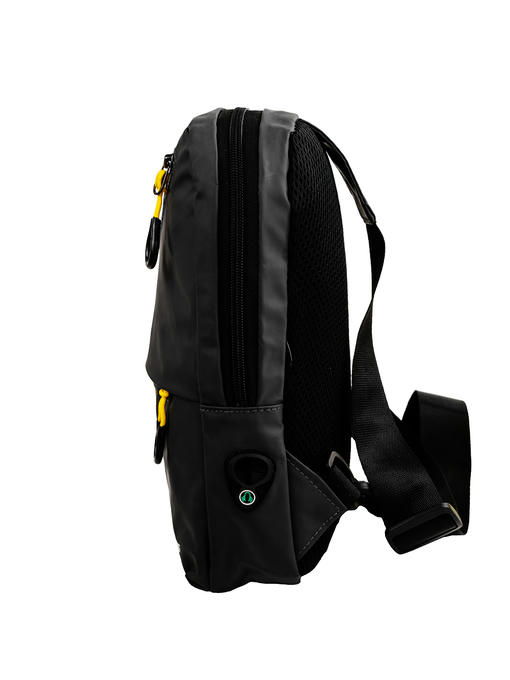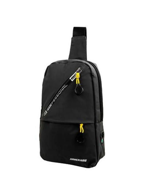 Сумка-рюкзак имеет прорезь для наушников на одном боку и выход для шнура на другом.