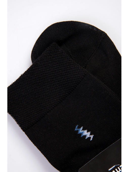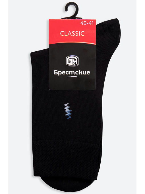Демисезонные мужские носки связаны из пряжи с высоким содержанием хлопка, благодаря чему отлично пропускают воздух, позволяя стопе дышать. Носки выполнены в черном цвете, украшены небольшим рисунком на паголенке.