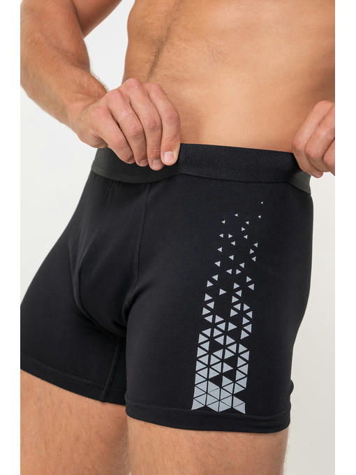 Классические трусы шорты украшены абстрактным рисунком на бедре. Мягкая резинка по талии, удобная анатомическая ластовица, застежка на пуговицу обеспечивают идеальную посадку, благодаря чему нижнее белье будет комфортно ощущаться на теле и во время активных занятий, и во время отдыха.