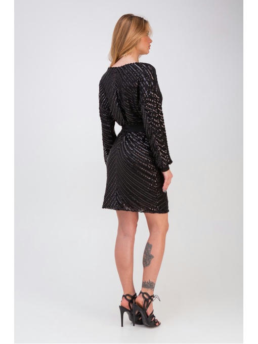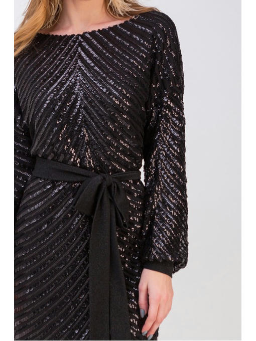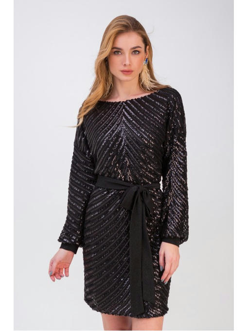 Нарядное платье простое и элегантное. Модель прямого силуэта сделана из ткани с пайетками. Вытянутый вырез в форме . Спущенный широкий рукав с манжетом. Платье без застежеки. В комплекте однотонный пояс из легкого материала, который служит утонченным акцентом.