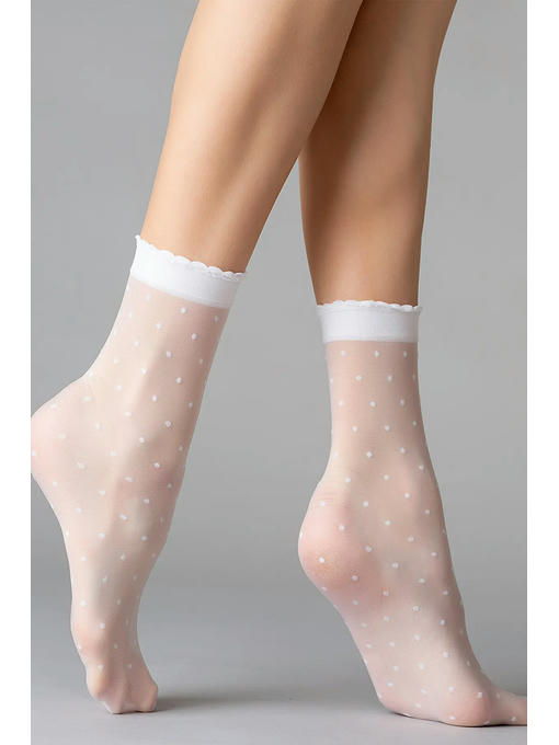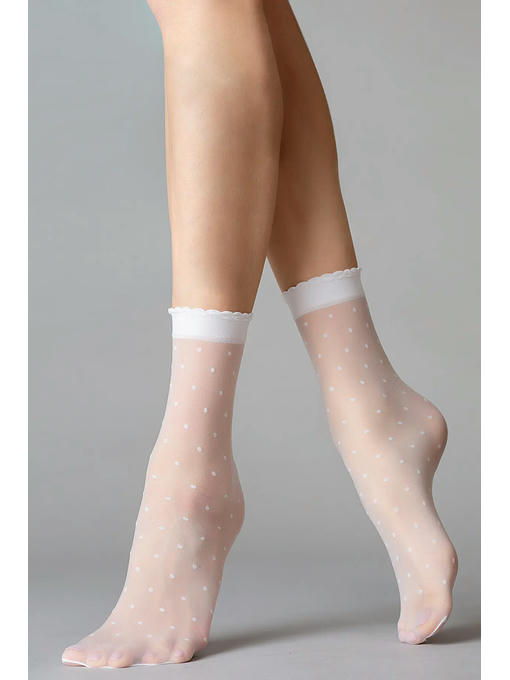 Тонкие фантазийные носки плотностью 20 ден, с усиленным мыском и комфортной резинкой с ажурным краем. Вся модель украшена тканым узором “мелкий горошек”