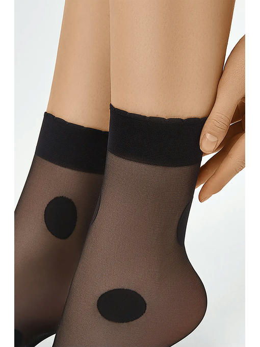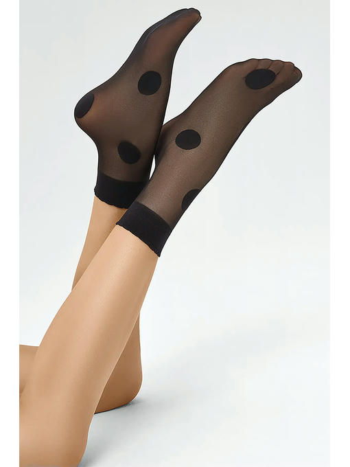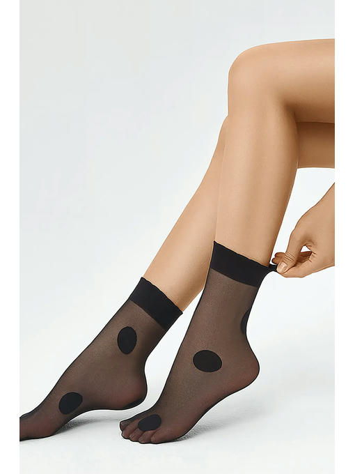 Тонкие фантазийные носки плотностью 20 ден, с комфортной ажурной резинкой и невидимым усиленным мыском. Вся модель украшена эффектным тканым узором “крупный горох”