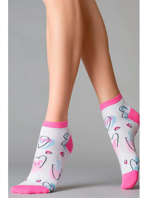 Укороченные хлопковые женские носки с контрастной комфортной резинкой и кеттельным швом. Вся модель декорирована ярким рисунком “сердечки” в сочетании с надписями “Love”