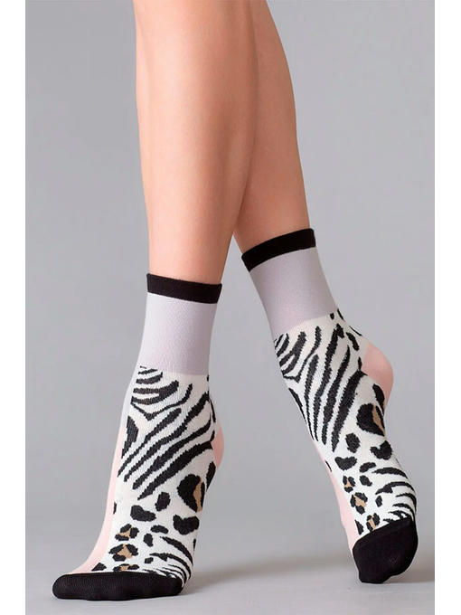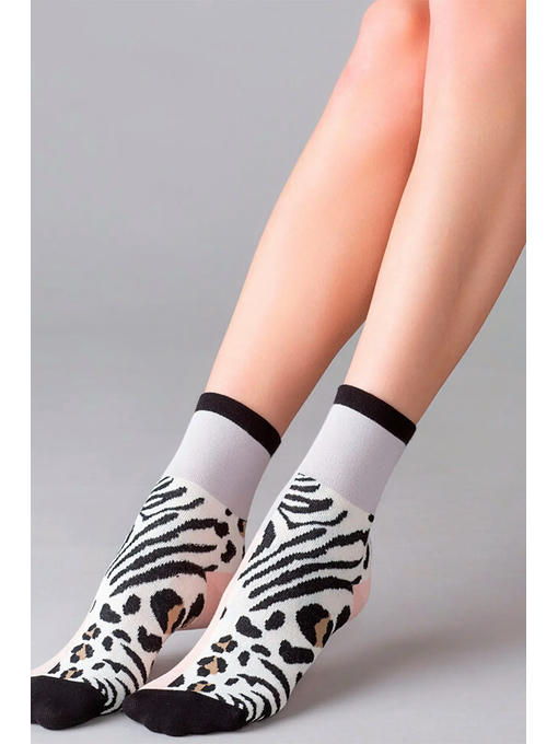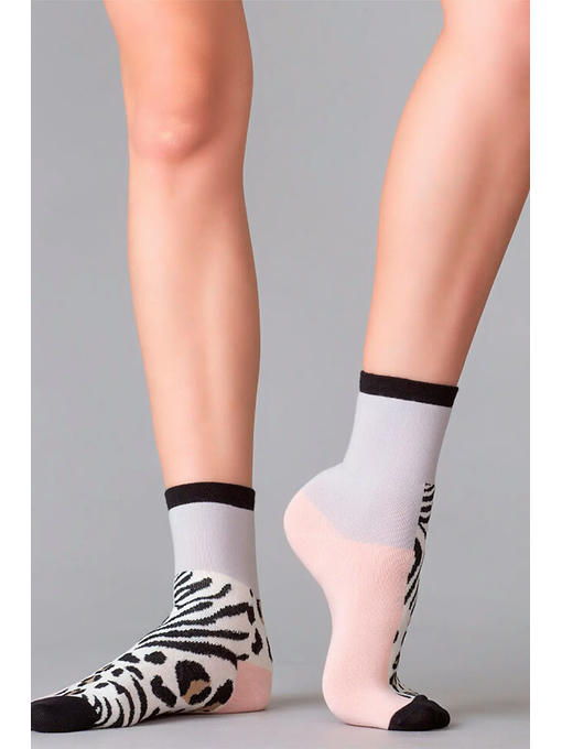 Хлопковые женские носки с комфортной резинкой и кеттельным швом. Контрастный дизайн модели из цветных блоков эффектно дополнен анималистичным принтом на нижней части фронта