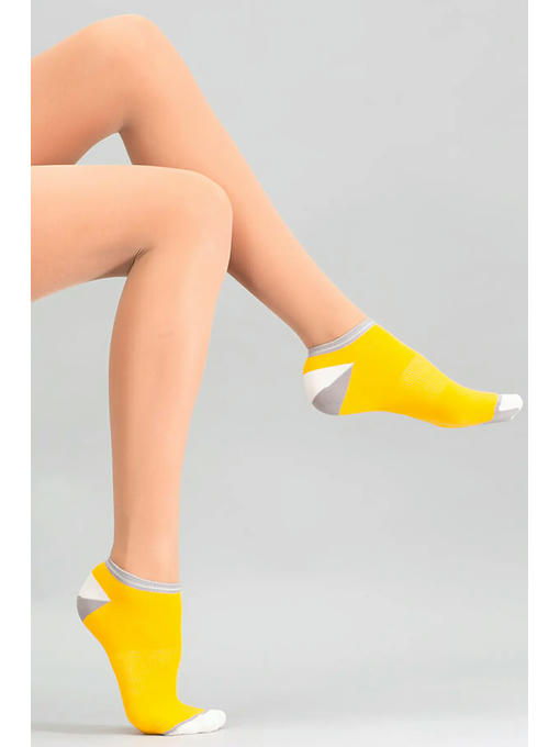 Укороченные хлопковые женские носки с контрастной комфортной резинкой и кеттельным швом. Пяточки, мыски и резинки декорированы геометрическим рисунком. Носки цветные, доступна обширная гамма оттенков