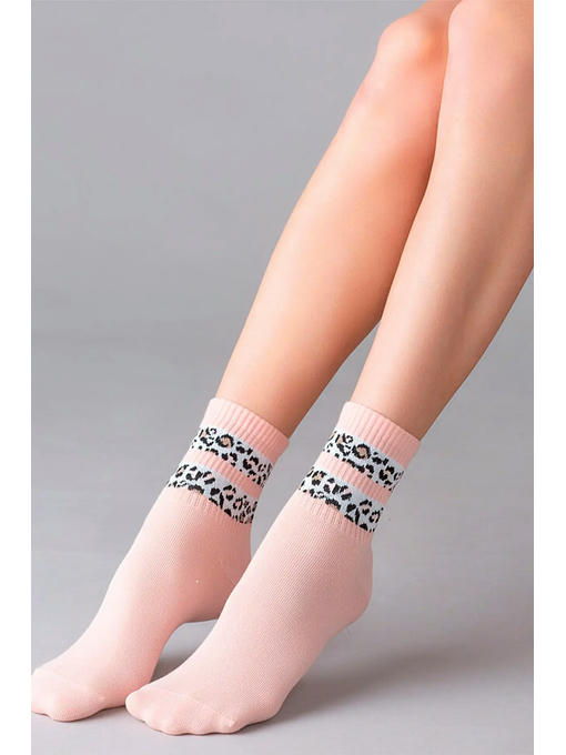 Хлопковые женские носки с комфортной широкой резинкой “в рубчик”, обеспечивающей идеальное облегание, и кеттельным швом. Резинка модели декорирована минималистичными вставками в виде полосок с леопардовым принтом