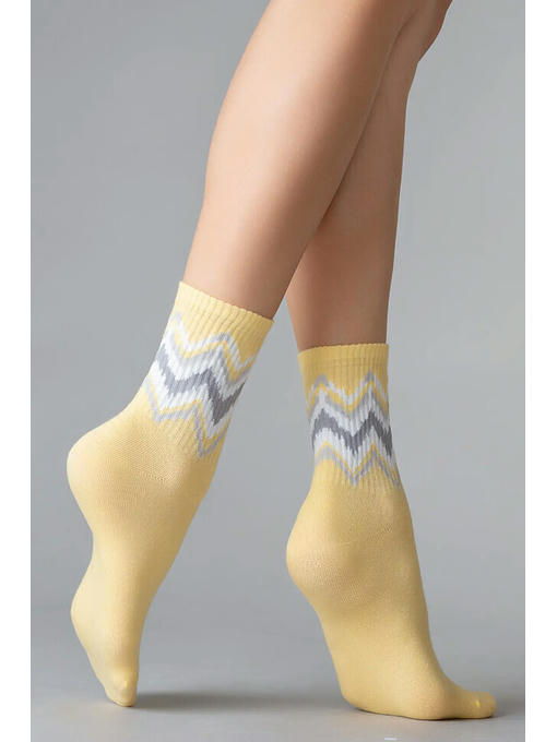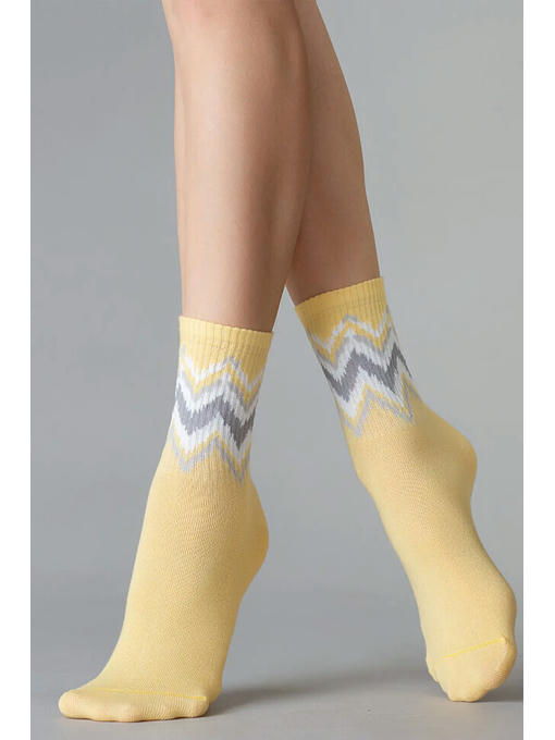 Хлопковые женские носки с комфортной широкой резинкой “в рубчик”, обеспечивающей идеальное облегание, и кеттельным швом. Резинка модели декорирована ярким геометрическим рисунком