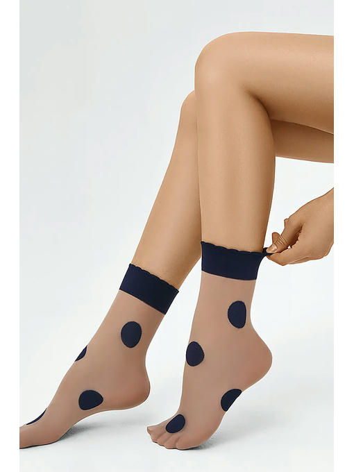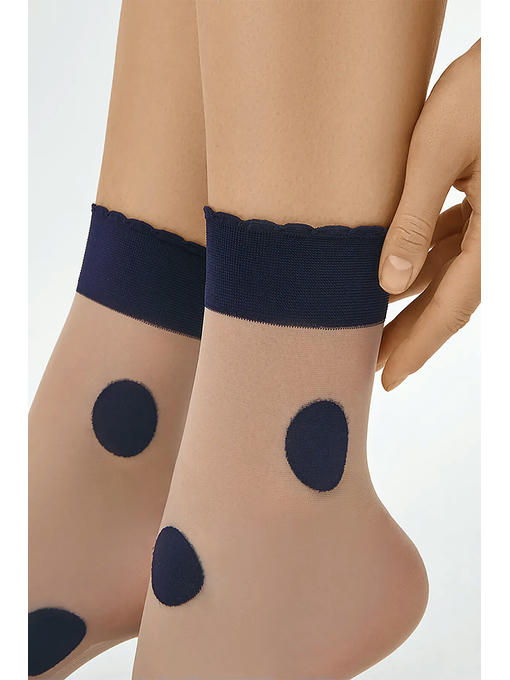 Тонкие фантазийные носки плотностью 20 ден, с комфортной ажурной резинкой и невидимым усиленным мыском. Вся модель украшена эффектным тканым узором “крупный горох”