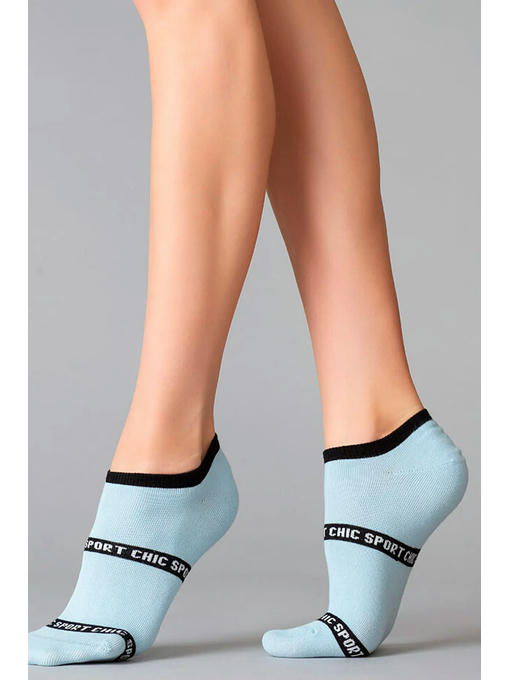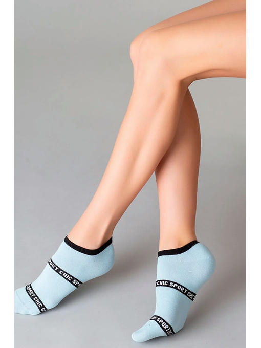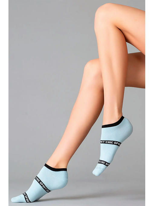 Укороченные хлопковые женские носки с контрастной комфортной резинкой и кеттельным швом. Стопа модели декорирована опоясывающим рисунком в виде полосок с повторяющимися надписями “Sport Chic”. Носки цветные, доступна обширная гамма оттенков