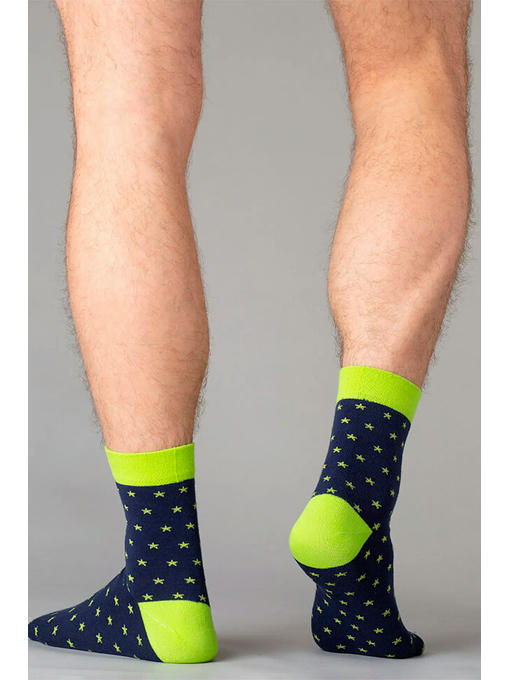 Хлопковые носки унисекс средней высоты выше щиколотки с контрастным дизайном резинки, мыска и пятки. Вся модели декорирована ярким рисунком “звездочки”. Удобная резинка обеспечивает идеальное облегание, а кеттельный (плоский) шов на мыске создает дополнительный комфорт